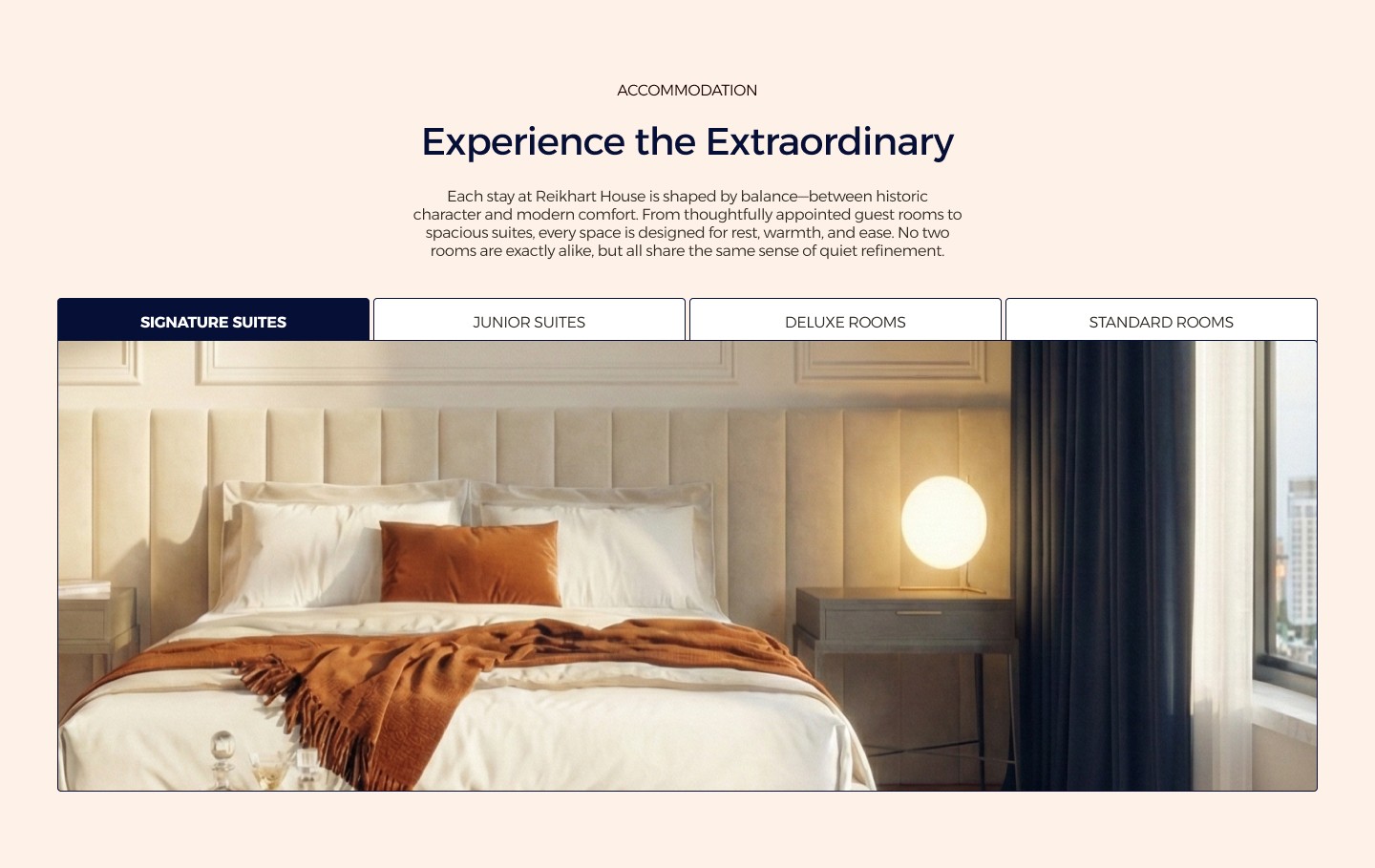Reikhart House is a boutique hotel rooted in warmth, heritage, and understated hospitality — with a quietly whimsical spirit woven throughout.This concept redesign reimagines the hotel’s digital presence as an extension of the stay itself. Rather than leaning on urgency or overt luxury, the focus is on restraint, pacing, and subtle moments of personality.The hotel’s mark — Jocko, Frank and Dolly Reikart’s pet monkey — appears throughout the property as a discoverable detail. The digital experience mirrors that balance: composed, refined, and lightly playful.